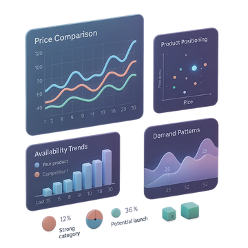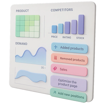 Сервис собирает данные каждые 24 часа, накапливает историю рынка и превращает её в стратегические отчёты: по товарам, изменениям, трендам, ключевым словам, сезонности и ценам.