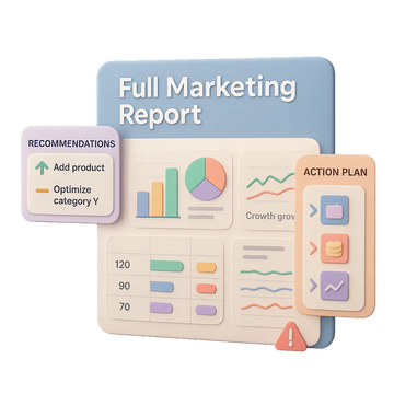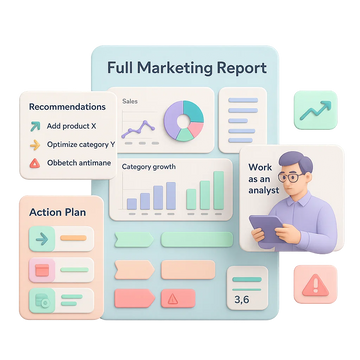 Сервис также создаёт полноценный маркетинговый отчёт с выводами, рекомендациями и конкретным планом действий. Это фактически работа персонального аналитика: что нужно изменить, какие товары добавить, где можно повысить маржу, какие категории дадут рост, и какие угрозы стоит учитывать заранее.