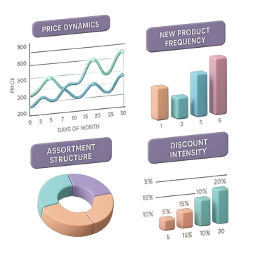 Все данные визуализируются в удобных графиках: динамика цен, частота новинок, структура ассортимента, интенсивность распродаж, сезонные всплески и спады. Такие графики помогают увидеть скрытые закономерности и заранее прогнозировать поведение рынка. Вы понимаете, какие товары будут востребованы, когда выгодно поднимать или снижать цену, и какие категории нужно усиливать в ближайшее время.